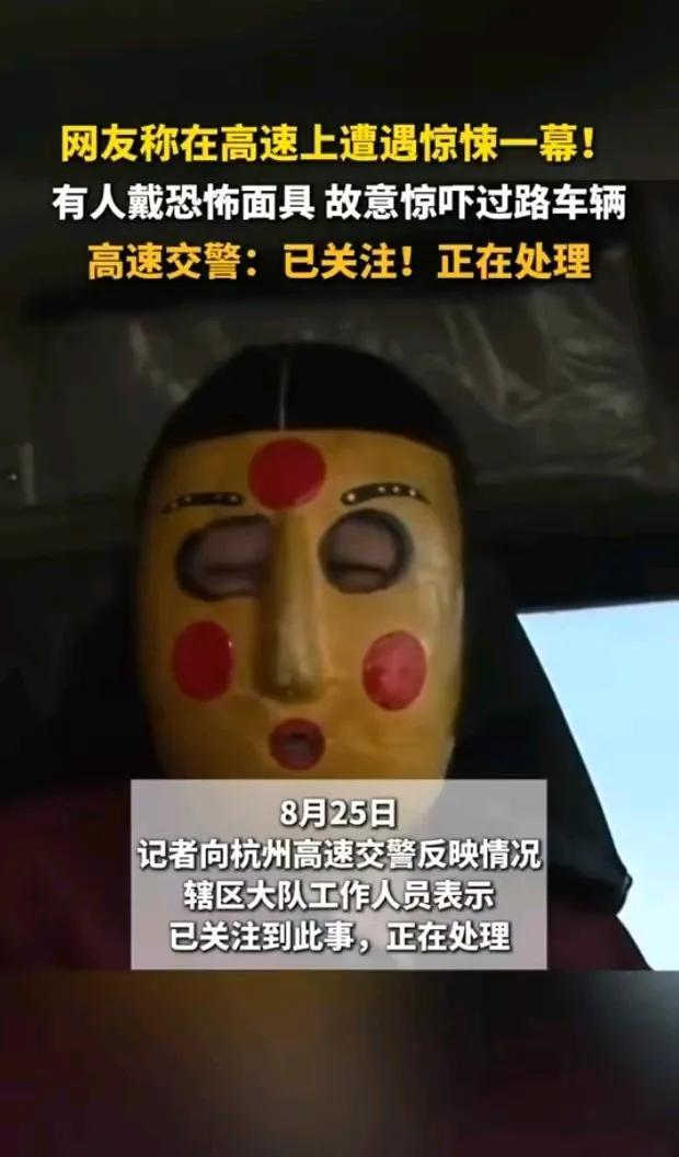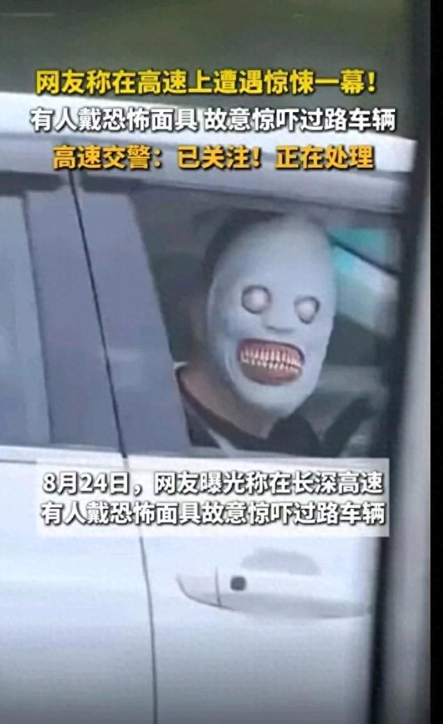 一段记录着高速公路上危险场景的视频在8月24日引发网络热议,有网友爆料,在长深高速杭州段,有人乘坐沪A牌照车辆时佩戴恐怖面具,故意对过往车辆进行惊吓。从曝光的视频中能清晰看到,涉事车辆与其他车辆在行驶过程中不时并行,佩戴面具的人员先是摇下车窗,微微起身将头部探出朝向相邻车道的车辆,短暂停留后又拉上车窗,却仍转头持续注视被惊吓的车辆,整个过程充满刻意性。