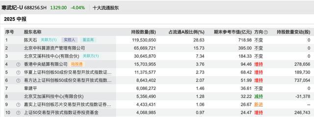 寒武纪2025年半年报前十大流通股东图片来源:Wind