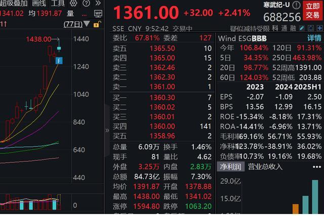 (8月27日,寒武纪股价一度突破1400元,总市值超5800亿元。截至发稿,该股涨幅收窄至2.41%,报1361元。)