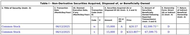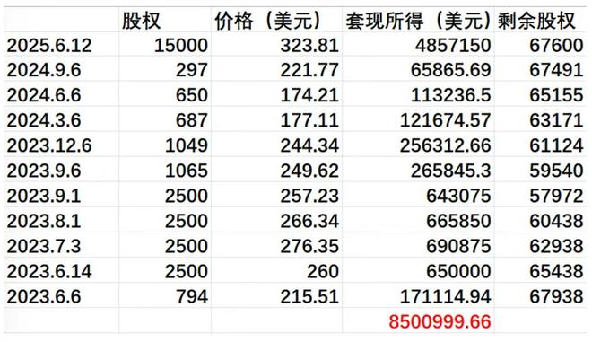 2025年:6月12日,一次性行权并卖出15000股,行权价仅20.57美元,而市场价高达323.81美元,总计套现约485.7万美元,净利润约455万美元。