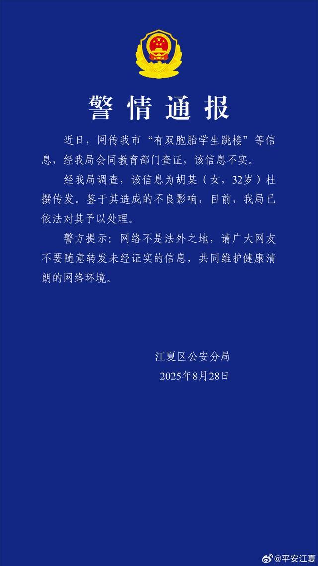 武汉江夏警方回应“双胞胎学生跳楼”:不实,杜撰者被处理