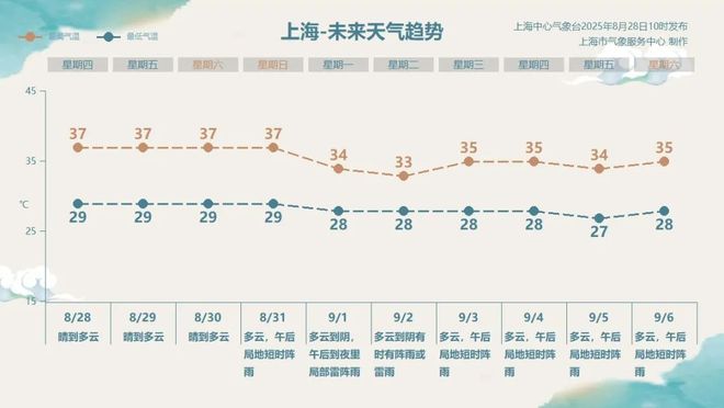 2025年8月28日12时23分,上海中心气象台更新高温黄色预警信号为高温橙色预警信号:预计中心城区今天的最高气温将超过37℃,请注意防范强高温对工农业生产、人体健康的不利影响,确保生产、消防、用电等方面的安全。