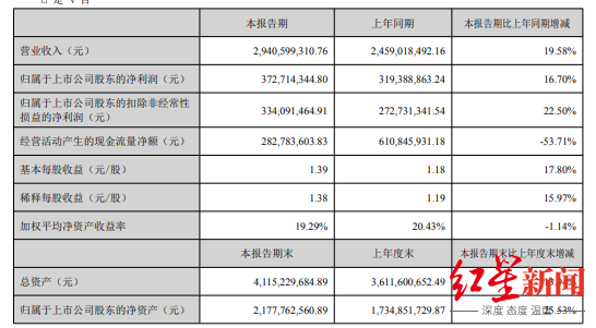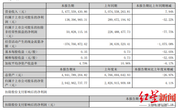 上半年,三只松鼠的营业收入为54.78亿元,同比上升7.94%;归母净利润为1.38亿元,同比下降52.22%;经营活动产生的现金流量净额为亏损3.77亿元,去年同期为3863.95万元。