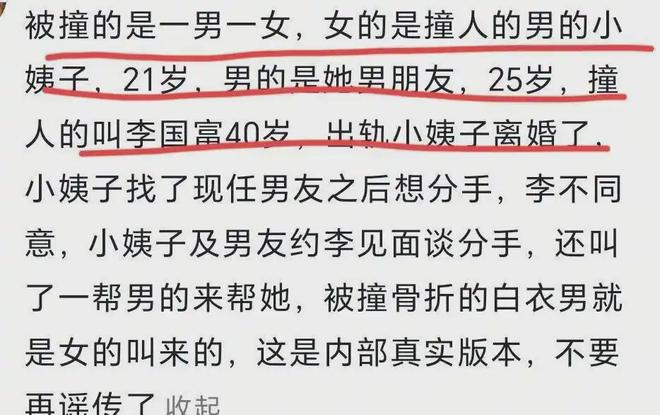考虑到李国富性格可能不稳定,小姨子担心单独见面协商会引发冲突,便带着新男友以及其他朋友一同赴约,以便好好把分手的事情说清楚。可谁也没料到,这场以“和平沟通”为目的的见面,最终却成了悲剧的导火索——双方没聊几句就陷入争执,李国富当场翻脸,随后便做出了开车冲撞小姨子与其男友的极端行为(被撞伤白衣男子为其小姨子朋友)。