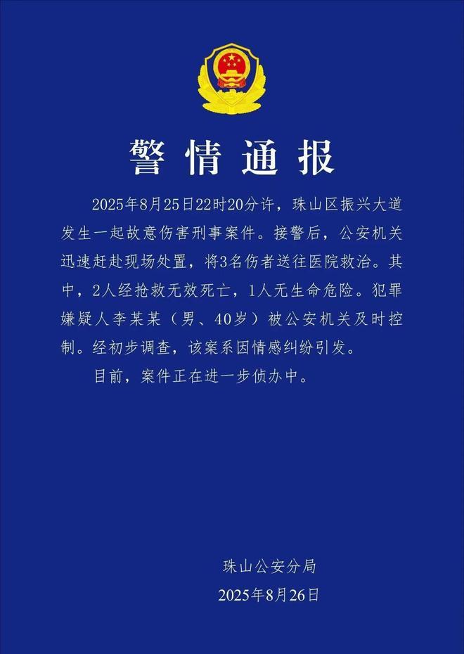 8月26日,江西景德镇市公安局珠山分局发布的官方通报,为这场悲剧提供了更清晰的信息:2025年8月25日22时20分许,珠山区振兴大道发生一起故意伤害刑事案件。公安机关接到报警后,第一时间赶赴现场开展处置工作,同时将3名伤者紧急送往医院救治。遗憾的是,其中2人经全力抢救无效死亡,另外1人经检查无生命危险。犯罪嫌疑人李某某(男性,40岁)已被公安机关及时控制,无逃脱风险。经初步调查,该案的起因是情感纠纷,具体细节仍在进一步侦办中。