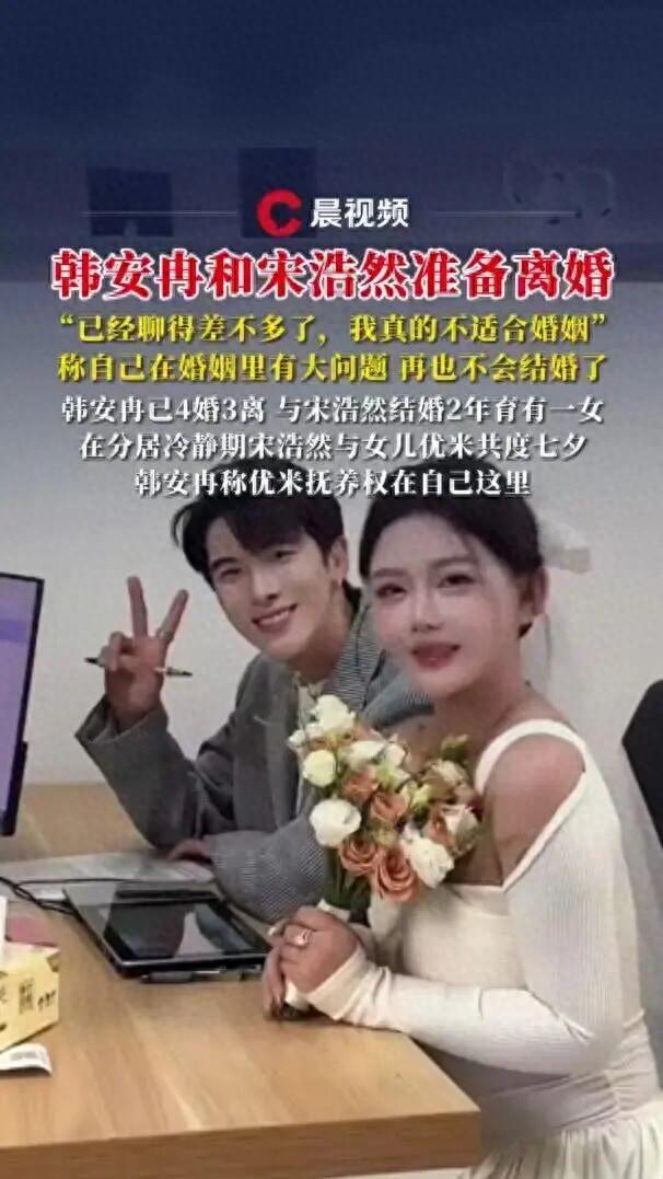 回溯她与宋浩然的缘分,两人于2022年12月5日官宣恋情,彼时宋浩然比韩安冉小三岁。经过半年左右的相处,2023年6月20日,韩安冉通过晒出结婚照的方式,宣布自己第四次结婚。同年12月31日,她再次发文官宣怀二胎的喜讯,第二个孩子最终于2024年9月出生。然而这段婚姻并未维持太久,如今两人已进入分居冷静期,七夕期间,宋浩然曾陪伴女儿优米度过,而韩安冉则在相关话题中提及优米的抚养权归自己所有。