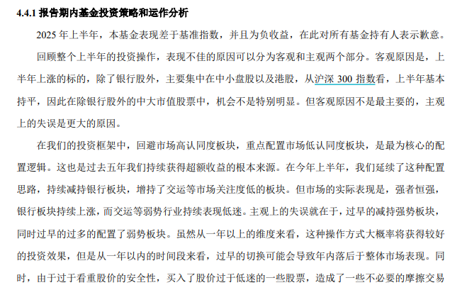 例如,华夏基金郑晓辉管理的华夏优势增长,上半年净值上涨4.92%,跑输业绩基准超过4个百分点。郑晓辉在基金中报中表示:“报告期内,本基金适度增加了股票仓位。增持了部分即将迎来基本面拐点、估值较低的军工股,以及部分受益于国产替代和科技创新产业趋势、研发能力较强、估值相对较低的优质个股,减持了部分短期涨幅较大而基本面低于预期的个股。由于低估了整体市场对部分‘业绩萌芽期’行业给予的估值大幅波动所带来的机会,报告期本基金净值表现一般,在此深表歉意。”