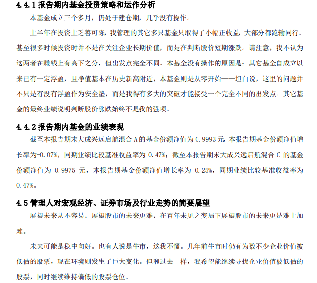 “本基金成立三个多月(注:截至6月末),仍处于建仓期,几乎没有操作。上半年在投资上乏善可陈,我管理的其它多只基金只取得了小幅正收益,大部分都跑输同行。甚至很多时候投资时并不是在关注企业长期价值,而是在判断股价短期涨跌。”徐彦认为,两种投资方式没有高下之分,但出发点完全不同。在他看来,判断股价涨跌始终不是自己强项,这也是大成兴远启航这只基金从零开始需要考虑的问题。