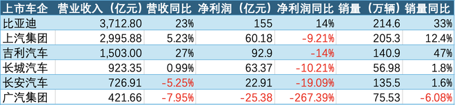 蛋糕不断做大的同时,各家车企赚到的钱并没有明显增加:从营收来看,多家车企均实现增长,其中比亚迪和吉利(0175.HK)的营收均创下历史新高;但从净利润来看,仅有比亚迪维持了增势,但其汽车毛利率也下滑了两个百分点。