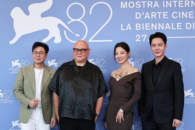 9月5日,在意大利威尼斯,电影《日掛中天》主创人员出席拍照式。新华社 图
