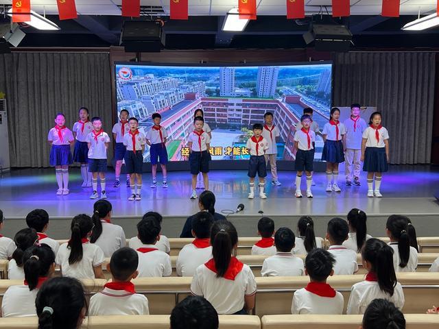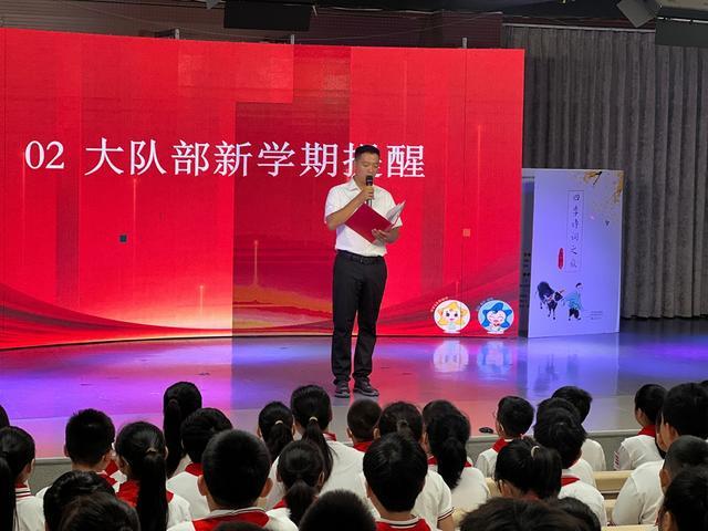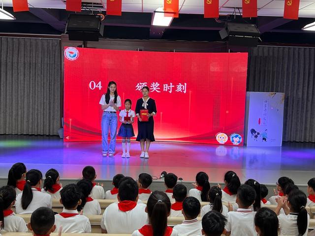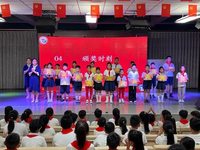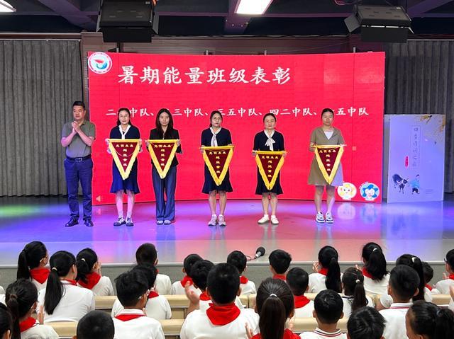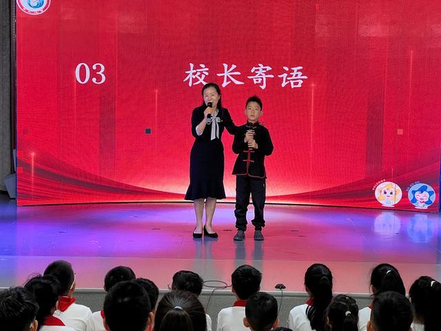 德育主任弓程老师为同学们送上新学期提醒与嘱托。随后,刘校长登台分享,为师生们加油鼓劲。典礼还对暑期表现优异的个人与集体进行表彰:王校长、高校长、郭主任为任宛清等22名“暑期光明使者”颁奖;李书记为二一中队等5个“暑期能量班级”班主任颁奖;河南商报记者范老师为陈霏霏同学及辅导老师胡玉肖颁奖,陈霏霏的习作已刊发并获20元稿费;河南惠济经济开发区综合办公室副主任张东旻、迎宾路街道党工委委员王桂香、林语溪岸社区党支部书记宋雅青为徐梓睿等10名“社区最美小读者”颁奖。