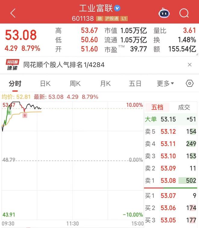 红星资本局9月10日消息,今日开盘,果链巨头工业富联(601138.SH)股价高开高走,盘中触及涨停。截至发稿,涨8.79%,报53.08元/股,总市值1.05万亿元。