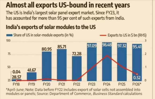 50%的总体关税对印度经济的影响是巨大的,尤其是依赖美国市场的出口产业。其中,出口美国占比超过95%的印度光伏产业更是沉重打击。此前,印度刚宣称其光伏产能超过100GW的里程碑,而现在,为这些产能寻找新的出路变得迫在眉睫。