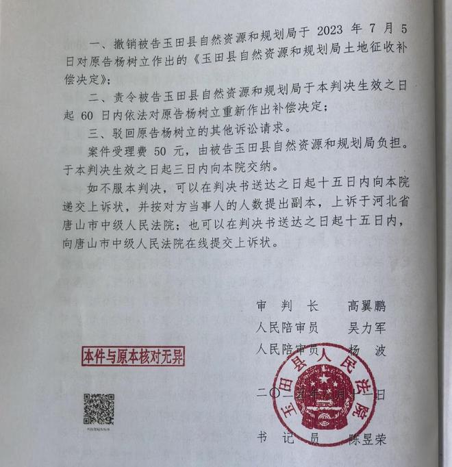 杨树立认为补偿严重不合理,继续起诉。2022年12月28日,玉田县人民法院撤销该补偿决定,要求该局“结合物价上涨、杨树立多年未获补偿的损失等因素,给予公平补偿”。
