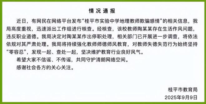 目前,桂平市教育局已针对此事发布通报,确认陶某某存在生活作风问题且违反职业道德,学校已对其作出辞退处理,相关部门也已启动进一步调查程序。不过通报中并未披露更多细节,仅强调请广大网友不信谣、不传谣,这一回应也引发了部分网友对调查深度与后续处理的关注。