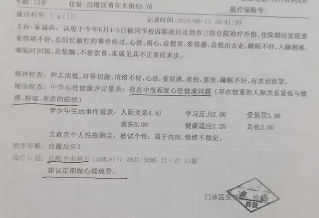 6月11日前后,关山发现关灵不好好吃饭,情绪低落,时不时情绪就会崩溃,独自哭泣。关江说,医生称孩子可能出现了心理问题,他们便送至辽阳市第四医院就诊,医生初步诊断为“应激反应?”,认为存在中度程度心理健康问题(存在较重的人际关系紧张与敏感、抑郁、焦虑的症状)。