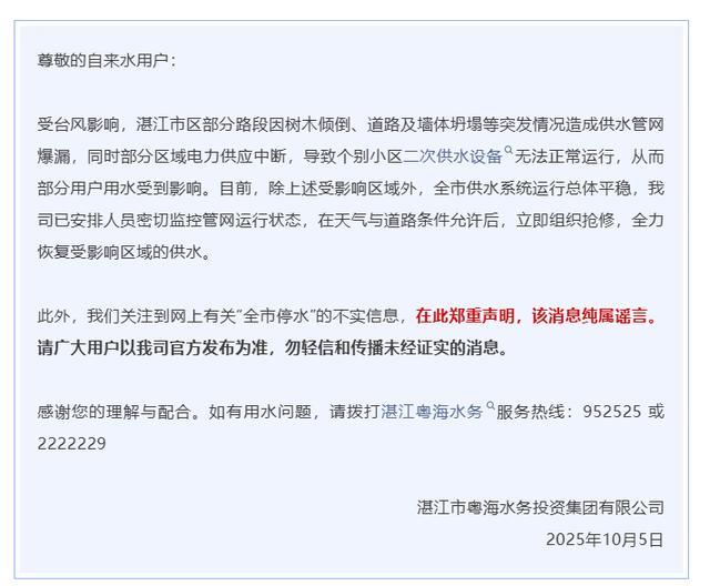 10月5日晚,广东湛江水务公司发布信息称,受台风影响,湛江市区个别小区部分用户的用水受到影响,但全市供水系统运行总体平稳,网上有关“全市停水”的信息纯属谣言。