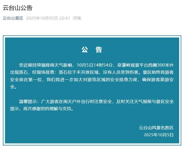 10月5日,有网友发视频称,河南焦作云台山景区发生山体滑坡落石,现场升起巨大灰尘,游客纷纷远离。