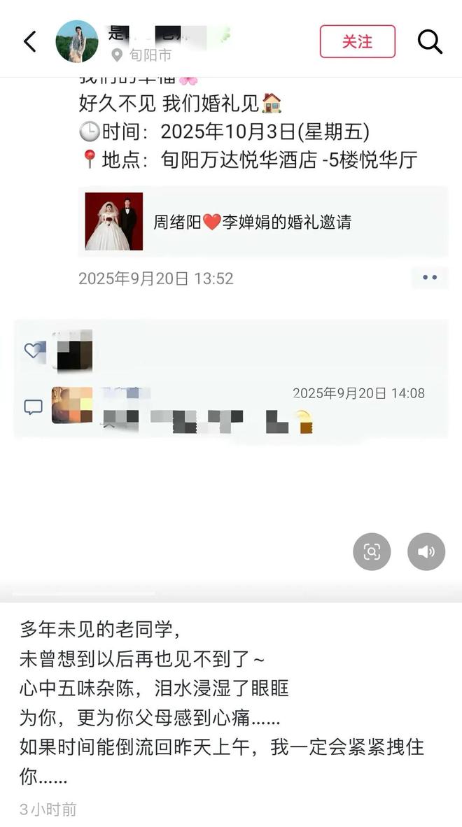 除了对“琐事”的追问,更多网友将心疼的目光投向了周绪阳的父母。一位网友分享自己的经历:“我的儿子也是10月3号办的喜宴,回家就刷到这条消息,真的想不明白,天涯何处无芳草,新郎何至于走上这样一条不归路,让他的父母情何以堪?”还有人直言:“辛辛苦苦二十年,消失就在一瞬间,大不了不娶,何必走上绝路呢?父母养他这么大,他走了,父母后半辈子的希望不就没了吗?”“糊涂的男生,大不了就不结婚,想过父母吗?白发人送黑发人,这痛是一辈子的啊!”这些评论里,没有激烈的指责,只有对父母晚年伤痛的共情,和对周绪阳“不值”的叹息。