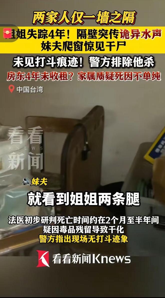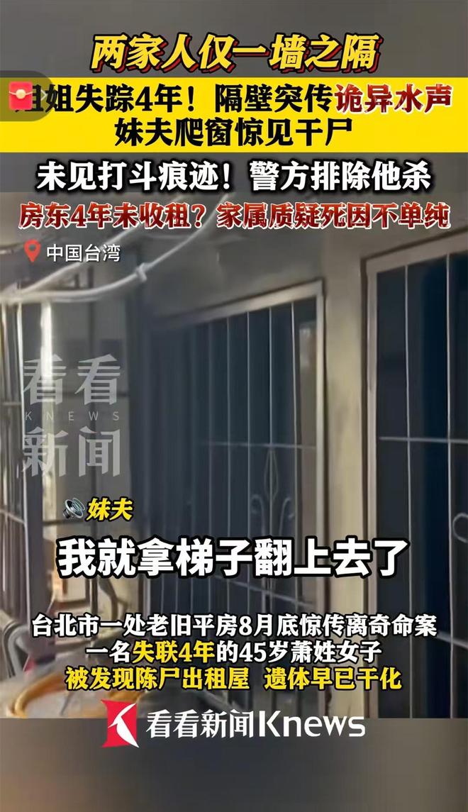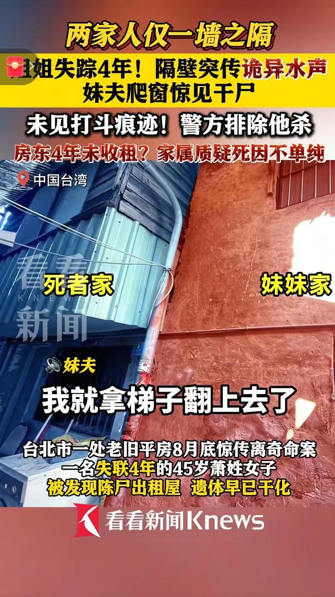 据10月7日的报道称,故事的起点要拉回四年前,那时萧姓女子还和妹妹有联系,却因为一场争执,她选择了离家,从此便断了音讯。对于家人来说,这四年里的每一天都充满了牵挂,他们四处打听消息,却始终没有任何线索,这份焦急在去年达到了顶点,家属无奈之下选择报警协寻,可最终还是没能找到她的下落。或许是出于一丝不愿放弃的希望,今年年初,萧姓女子的妹妹一家搬到了她租屋的隔壁——这个决定原本是想离姐姐可能存在的痕迹更近一点,哪怕只是能多留意一下这间屋子的动静,却没想到,这成了揭开悲剧的关键一步。