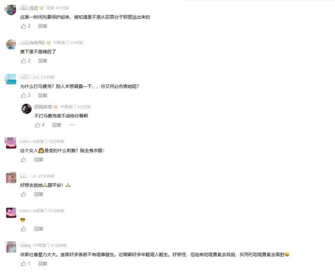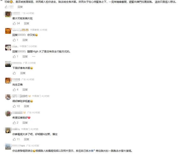 但这类猜测很快遭到反驳,澳门本地网友率先提出不同视角:“会不会是被人无理禁锢,脱了衣服才趁机逃出来的?”这番担忧迅速引发共鸣,有网友紧接着呼吁“先关注女子安全,万一她是受害者,得优先做好保护措施,别让犯罪分子有可乘之机”;不过也有网友结合常见社会现象提出另一种可能,觉得“最大概率是‘嗨大了’(吸食违禁品后失控)”,认为女子的异常行为或许是药物影响下的判断失常。