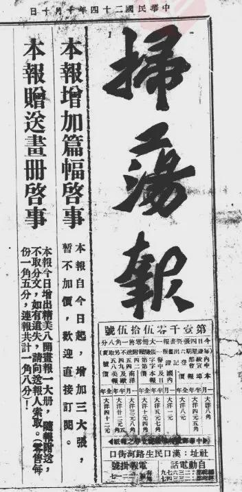 自1935年10月10日起,增加至三大张十二版,以本期为例:第一版广告,第二版广告加社论,第三版国内新闻,第四版国际新闻,第五版国际新闻加广告,第六版“第六届全国运动会特刊”,第七版各地通讯,第八版副刊,第九版省内新闻,第十版社会新闻,第十一版经济交通,第十二版《瞭望哨》。十二版的《扫荡报》经常有特刊、周刊,再如1937年6月15日第九版的汉市夏令卫生运动宣传周特刊,宣传卫生的重要性,题词有“防患未然”、“疠疫不作”等。