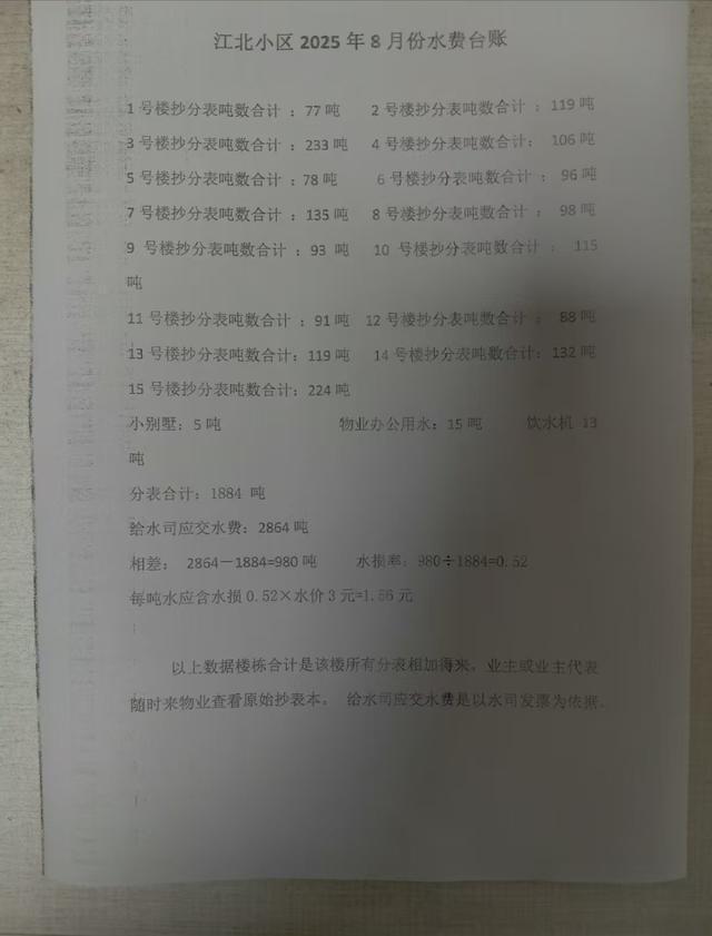 张师傅介绍,物业统计今年6月水费,小区15栋楼的分表抄表为1599吨,该小区水务公司的总表为2134吨,相差535吨。“物业算的账,业主每使用1吨水就会有0.33吨损耗。6月我们的水费是正常的3元水费加0.99元‘水损费’,一共是3.99元每吨。物业按照每户的分表抄表收费。谁知到8月份水损更高了,每吨水按照4.56元收取。”