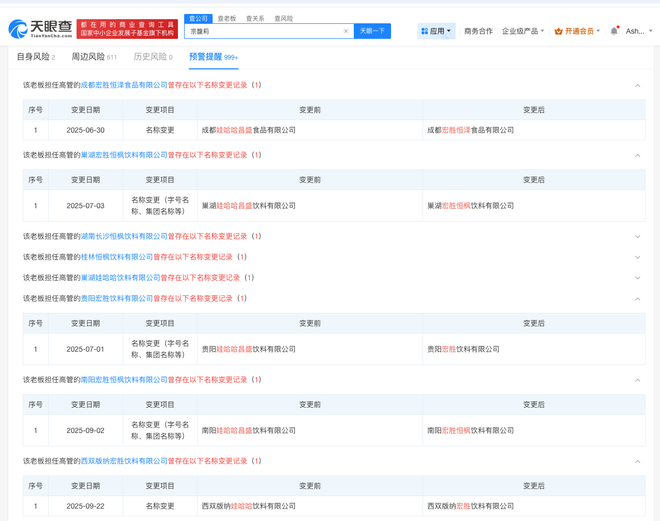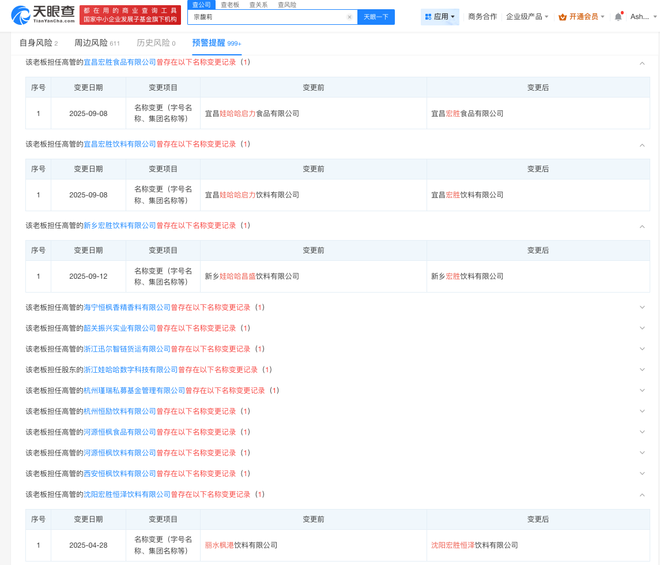 天眼查信息显示,9月以来,多家原名与娃哈哈有关的公司发生工商变更,企业名称变更为宏胜,宗馥莉均在上述公司担任高管。例如,9月22日“西双版纳娃哈哈饮料有限公司”更名为“西双版纳宏胜饮料有限公司”。9月8日“宜昌娃哈哈启力饮料有限公司”更名为“宜昌宏胜饮料有限公司”。9月2日,“南阳娃哈哈昌盛饮料有限公司”更名为“南阳宏胜恒枫饮料有限公司”等。此外,今年以来已有超十家娃哈哈旗下公司发生工商变更,企业名称变更为宏胜,包括杭州宏胜恒泽饮料有限公司、白山宏胜饮料有限公司等。