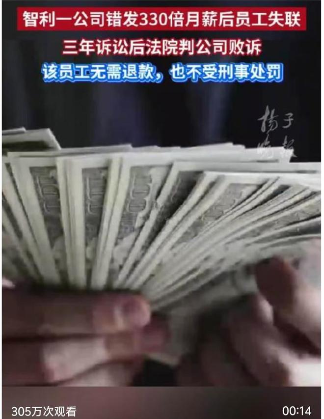 事件的源头要回溯到2022年5月30日。当时CIAL正按照月度流程推进员工薪资发放,作为一家覆盖多条冷切肉生产线、涉及供应链结算与日常行政的大型食品企业,其财务系统需同步处理数十名员工的薪资核算。一名负责办公室行政事务的助理在查收银行通知时,发现账户内多了一笔远超预期的资金——经核对,这笔到账金额为1.65亿智利比索,约合人民币123万元,而他的常规月薪仅为50万智利比索(约合人民币3700元),意外到账的资金相当于他330个月的薪资总和。