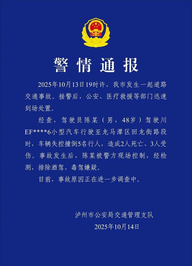 泸州发生一起严重交通事故,一名男子驾驶车辆撞死两人,撞伤三人,据初步了解,疑似其中一名被撞死者的家属透露,事故发生时死者已接近家门口,事故详情正在进一步调查中,这起事故造成了严重的人员伤亡和伤害,引起了社会各界的关注和关注,相关部门正在全力处理事故后续事宜,并展开调查以查明事故原因和责任。