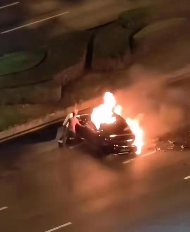 最先冲上去的是路过的出租车司机张师傅。他从后视镜里看到事故,一脚刹车停在路边,抄起后备箱的扳手就往起火点跑。“当时火还没完全烧起来,我看到驾驶位有人在动,就想拉开车门。”后来张师傅回忆,可不管他怎么使劲拽,车门都纹丝不动——那扇隐藏式门把手缩在车身里,按下去毫无反应。很快,几个夜班下班的年轻人也冲了过来,有人从包里翻出应急锤,朝着主驾车窗砸去,玻璃碎渣溅了一身,其中一个小伙子的手掌被划出血,也没顾上擦。可即便砸开了车窗,滚滚浓烟和灼热的气浪也让人无法靠近,更别提把被困者拉出来。