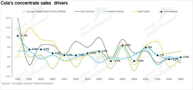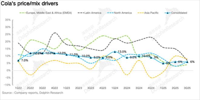 价:3Q25浓缩液价格同比增长6%,仍然是可口可乐内生增长的关键驱动因素。从区域上看,拉美和亚太地区是价格提升的主要驱动因素,而北美和欧洲受到高基数影响价格贡献稍有放缓。