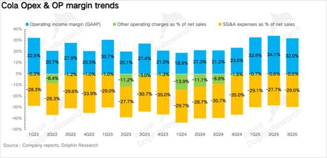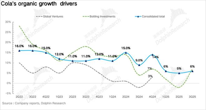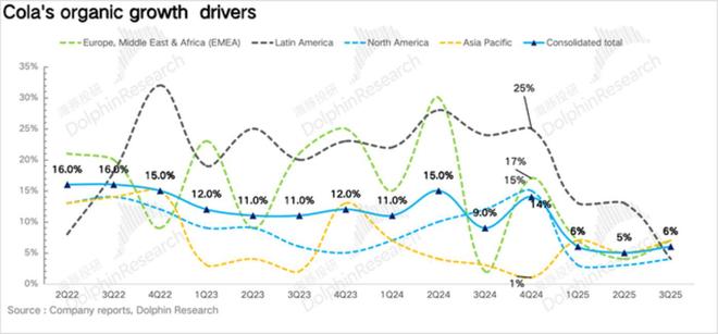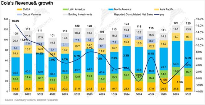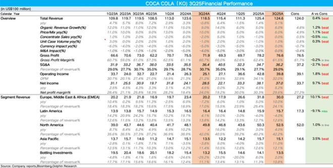 3Q25可口可乐实现表观营收124.6亿美元,同比增长5.1%,小幅超出市场一致预期。其中内生营收(Organic revenue)同比增长6%。