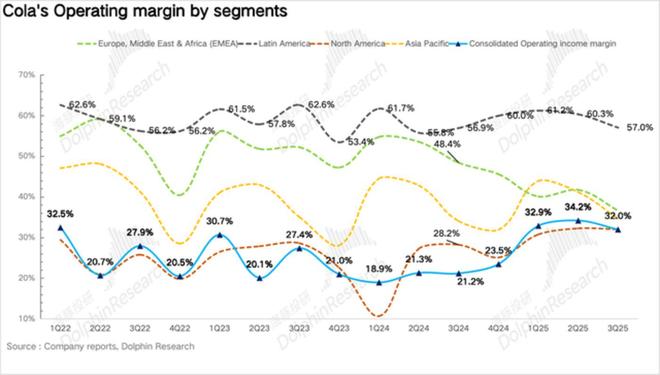 拉美地区实现营收15.7亿美元,同比下降4%,核心在于墨西哥、哥伦比亚等地区受到高利率、收入增长缓慢等宏观因素影响,居民消费意愿持续低迷。此外,汇率逆风虽然在三季度有所缓解,但拉美地区仍然是可口可乐全球范围内结构性逆风的最主要来源之一。