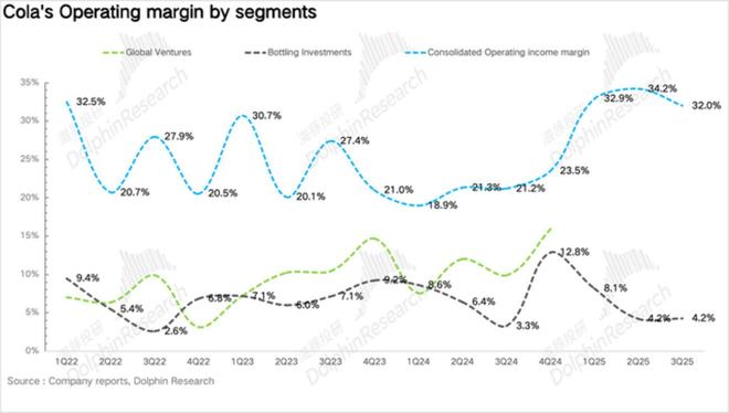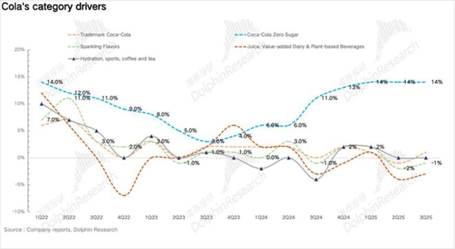 果汁、增值乳制品和植物性饮料同比下滑3%,降幅环比有所收窄。结合电话会信息,其中超滤牛奶Fairlife凭借高钙、高蛋白、低乳糖等优势在健康化浪潮中保持了非常强劲的增长,目前依然处于供不应求的状态,海豚君预计伴随2026年初可口可乐在纽约的新工厂达产,产能瓶颈逐步缓解有望带动Fairlife的销量再上一个台阶,而传统果汁(果粒橙、酷儿等品牌)由于含糖量高,基本已被消费者打上了不健康的标签,需求持续萎缩。