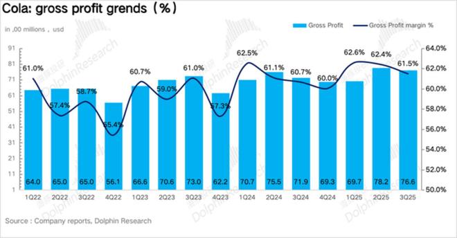 毛利率上,一方面可口可乐的核心原料(玉米糖浆、铝、PET切片)价格逐步走低,叠加产品结构提升,毛利率整体同比提升0.8pct,达到61.5%。