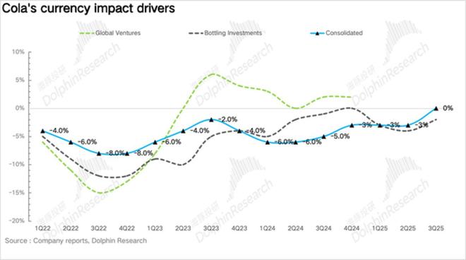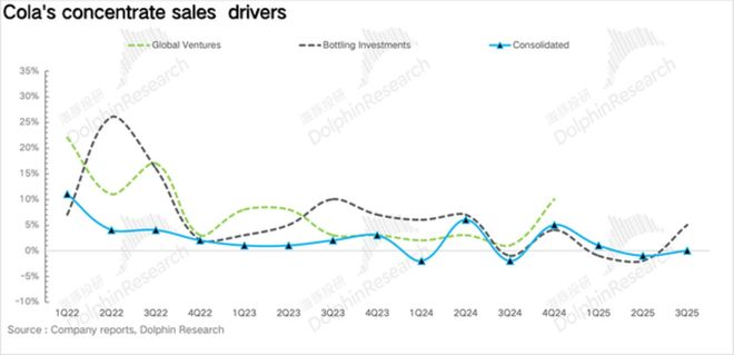 1、销量告别负增长。3Q25可口可乐实现表观营收124.6亿美元,同比增长5.1%,小幅超出市场一致预期。其中内生营收(Organic revenue)同比增长6%,量价拆分看,相较于上半年销量的负增长,公司从三季度开始针对消费力受损的人群积极推出单次购买价格更低的小罐装和环保包装,最终浓缩液销量同比持平。