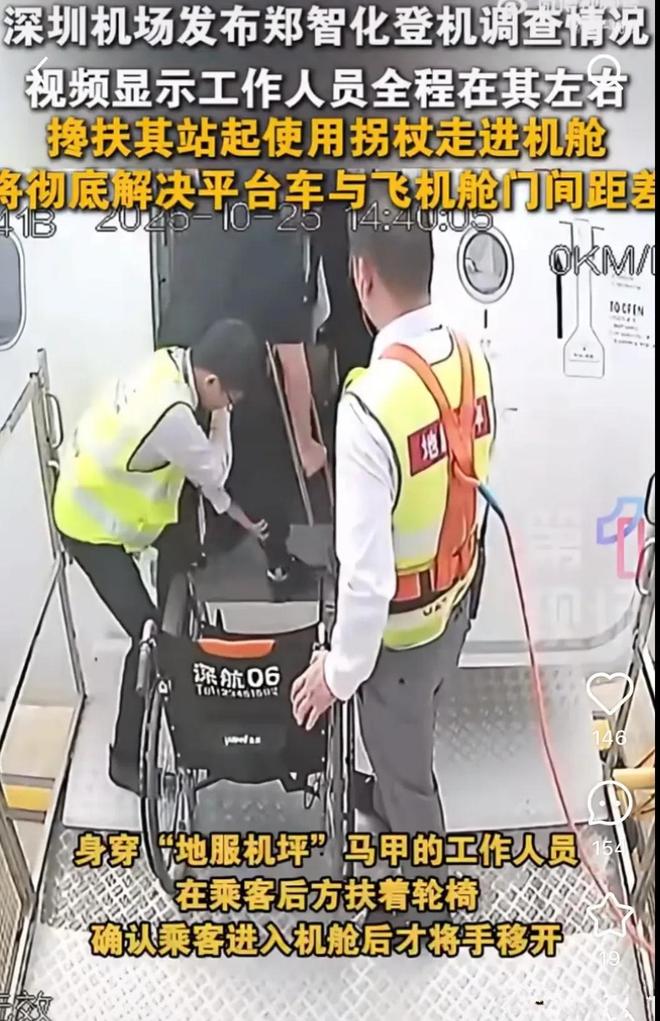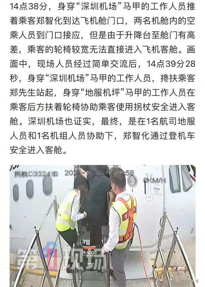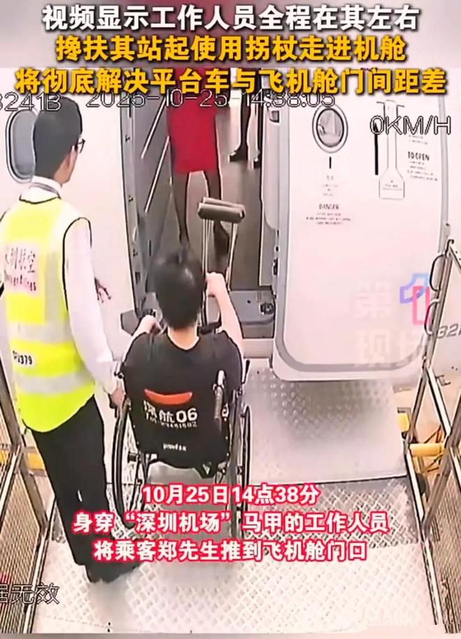 然而,当天深夜,深圳机场发布的详细调查结果与监控片段,让事件开始出现反转。根据机场通报,升降车与机舱门存在高度差并非服务疏忽,而是基于安全规范的必要操作——飞机在装卸货物过程中会出现上下浮动,为防止登机车与机舱门发生刮碰,行业规范要求两者需保持20厘米左右的安全间距。更关键的是,监控视频清晰记录了登机全程:两名工作人员(一名地服人员与一名机组人员)始终贴身搀扶郑智化,协助他拄着拐杖缓慢走进机舱,整个过程耗时约2分钟,画面中既无“连滚带爬”的动作,也未见司机“冷眼旁观”的场景。同时,深圳机场还公布了三项即时整改措施:未来将优先为轮椅旅客安排廊桥登机,远机位保障时将服务人员增至2名,同时试点带坡度的登机连接装置,从硬件与人员配置上优化无障碍服务。
