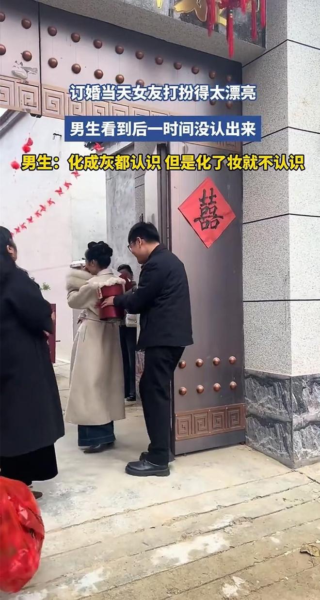 还有些网友结合自己的经历分享感受,字里行间都是共鸣:“我和我对象谈恋爱时,我平时很少化妆,第一次画全妆约会,他在约定的咖啡店门口来回走了两趟,都没敢跟我打招呼,后来还说‘你摘了眼镜、化了妆,感觉既熟悉又陌生,怕认错人尴尬’,现在看这对情侣,仿佛看到了当初的我们”“男生会懵很正常啊,毕竟朝夕相处的人突然换了风格,加上订婚本身就紧张,大脑一时反应不过来太正常了,反而觉得很可爱,不是吗?”。