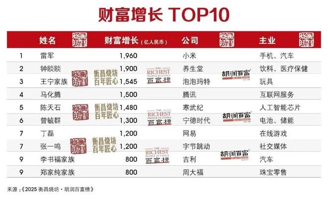 1198位企业家财富比去年增长,小米的雷军成为“增长王”,财富比去年增长1960亿元,主要得益于小米汽车业务的爆发式增长和手机高端化突破带来的盈利跃升;其他增长较快的企业家还包括泡泡玛特38岁的王宁,凭借Labubu全球爆红,财富增长1545亿元;寒武纪40岁的陈天石则凭AI芯片落地加速,业绩增长迅速,8月底股价一度超越茅台,财富增长1480亿元。