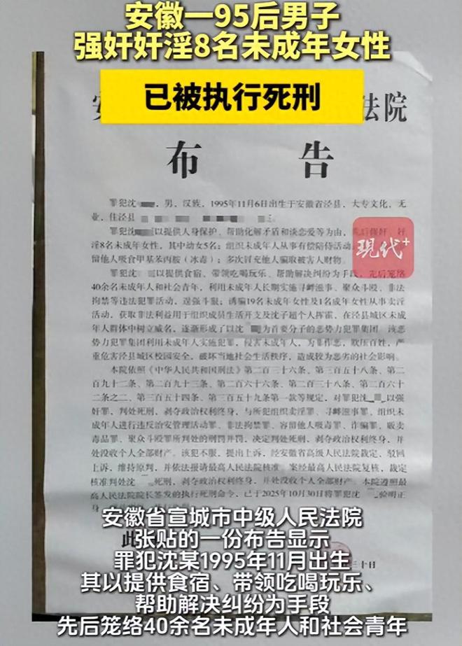 据11月3日的报道称,2025年10月30日,安徽宣城95后男子沈某被押赴刑场执行死刑。这位1995年11月出生的罪犯,以提供食宿、带领吃喝玩乐、帮人解决纠纷为诱饵,逐步笼络了40余名未成年人和社会青年,在泾县城区的未成年人群体中逞强斗狠、树立威名,最终形成了以他为首要分子的恶势力犯罪集团。在其主导的一系列违法犯罪活动中,最令人发指的是对未成年人的侵害——他先后强奸、奸淫8名未成年女性,其中竟有5名是幼女,同时还诱骗19名未成年女性及1名成年女性从事卖淫活动。除此之外,该犯罪集团还长期实施寻衅滋事、聚众斗殴、非法拘禁、容留他人吸毒、贩卖毒品、诈骗等多项罪行,对当地社会治安造成极大破坏。